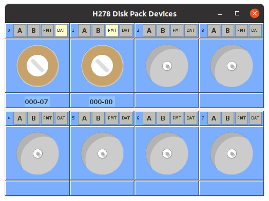 Each drive has a mount/unmount button that is depicted as the disk pack well. Clicking on the disk pack well opens a file dialog window for selecting the disk image to be mounted (clicking Cancel will leave no image mounted). Additionally, "FMT" and "DAT" buttons permit writing of track format and record data, respectively. In addition, "A" and "B" buttons exist to provide values to match against the A-File and B-File bits in record headers. These bits are treated as a mask, and "0" is always writeable (if "DAT" permit is on). So, if a record header has AB as "10", then that record can be written (only) if "A" is ON, but "B" may be ON or OFF (don't-care).
